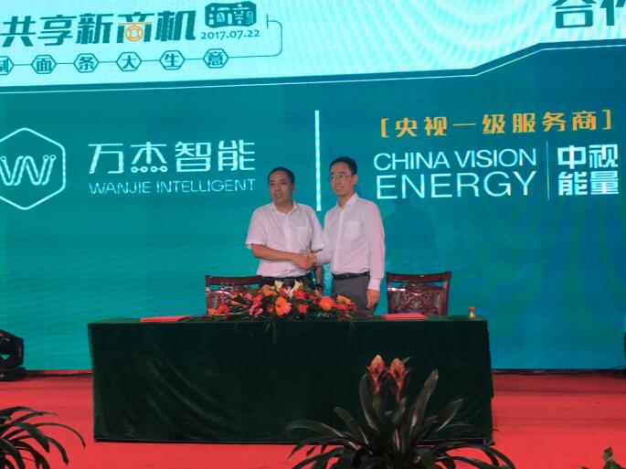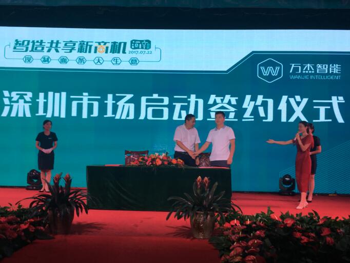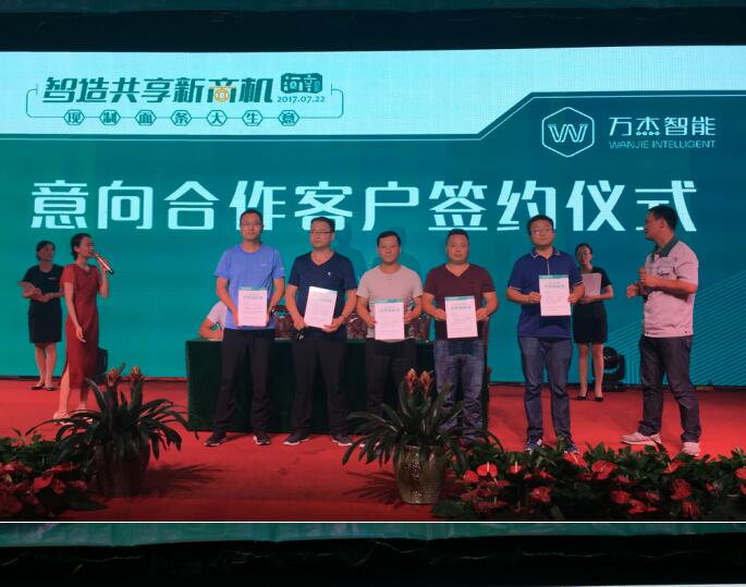 晚宴即將開始時,仍然有很多意向合伙人想要加入萬杰智能鮮面機項目中來,會務組因此臨時調整會議流程,推遲晚宴開始時間,為意向合伙人留出更多簽約時間,最終,萬杰智能成功與30余位意向合伙人簽署了意向合作書。 萬杰智能與中視能量(央視一級服務商)簽訂戰(zhàn)略合作協(xié)議 萬杰智能深圳市場正式啟動儀式 城市合伙人簽約儀式