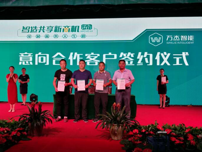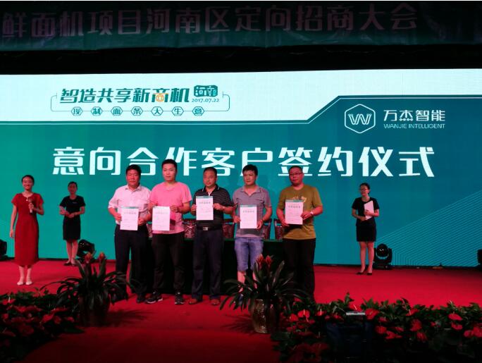 7月22日,智造共享新商機,萬杰智能鮮面機河南大區(qū)定向招商大會在許昌成功落下帷幕。超過70家意向合伙人(170余人)齊聚本次招募大會,當天有30余家意向合伙人簽訂合作意向書。